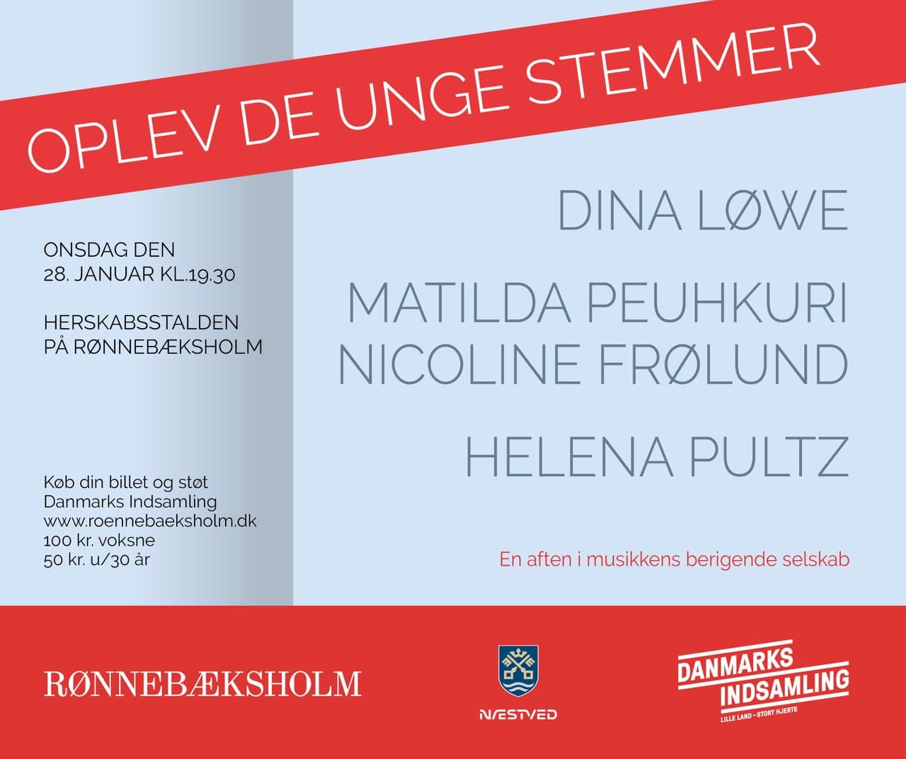 Kom og oplev unge musikalske stemmer fra Næstved: Helena Pultz, Matilda Peuhkuri med Nicoline Frølund og Dina Løwe. Og støt Danmarks Indsamling med dit billetkøb.