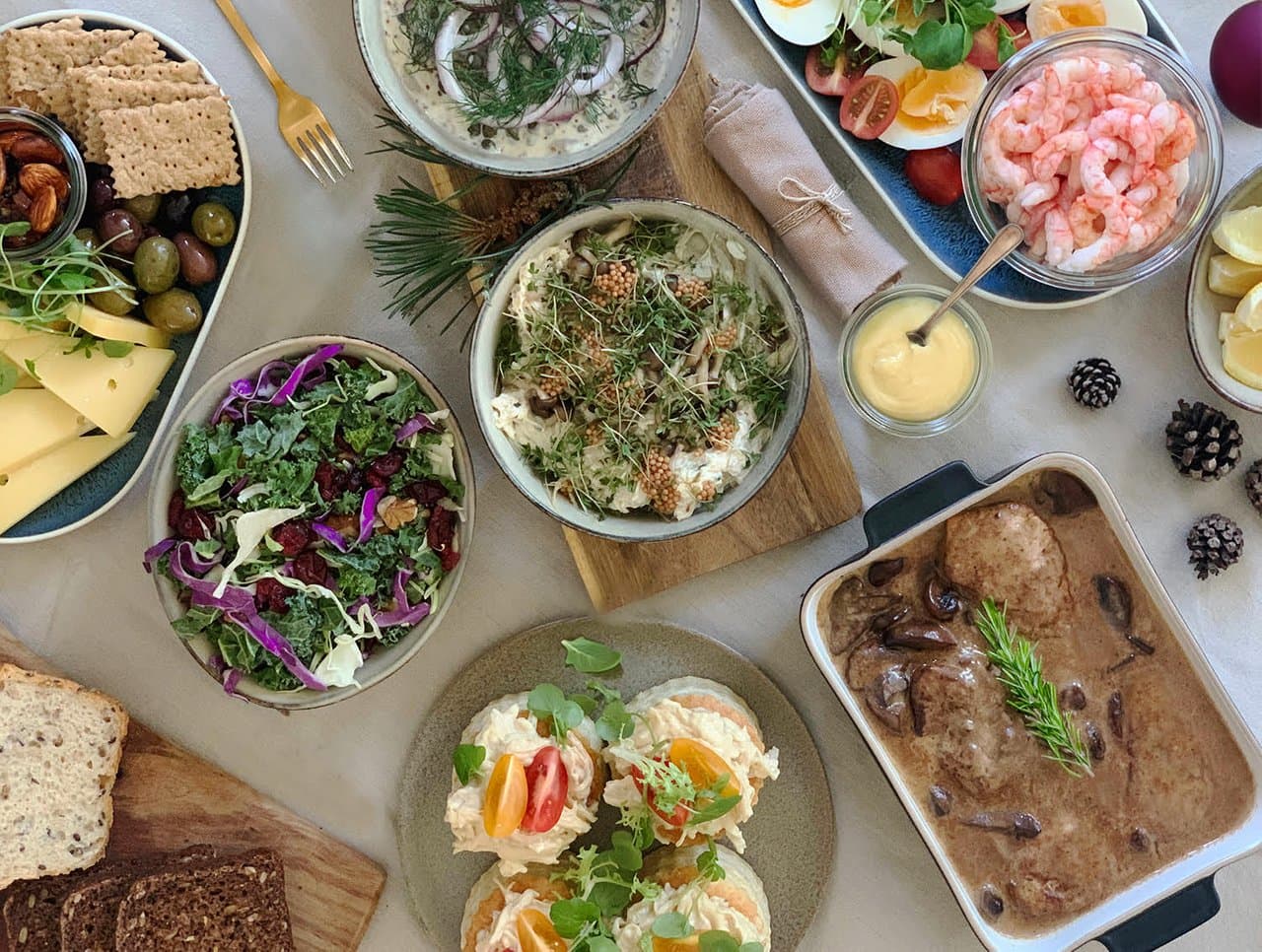Til denne julefrokost tilbyder vi en smagfuld og lækker menu fra NOERs To Go, hvor der serveres håndpillede rejer med dildmayo, Noer's hønsesalat med sennepskorn og syltede bøgehatte, blåbær/krystalost spegepølse af okse fra grambogård med syltede rødløg og aioli, serranoskinke med semitørrede tomater og pesto, kartofler vendt i rød pesto toppet med røget mandler. Primadonna, dertil sirup med tørret frugt og oliven. Til menuen serveres friskbagt brød.
